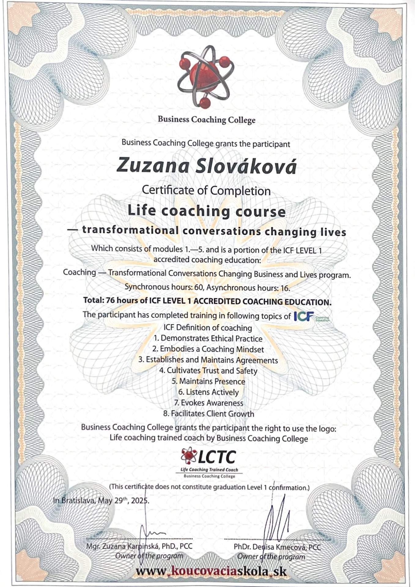 Výcvik koučingu som absolvovala v Business Coaching College v Bratislave